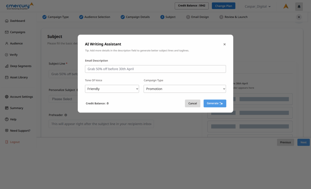 Struggling to craft subject lines that actually drive opens? With AI-powered subject line generation, you simply describe your campaign, and cmercury suggests optimized subject lines and preheaders based on open-rate trends, tone, and length.